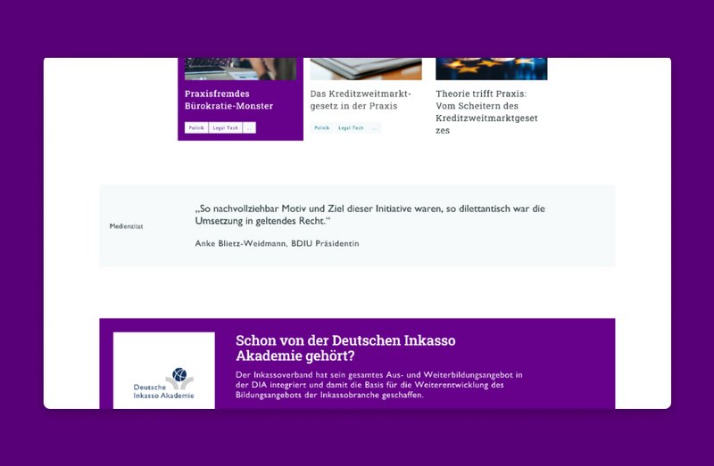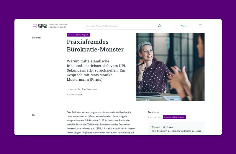 Das Ergebnis ist eine übersichtliche Plattform mit thematischen Rubriken, Tags, zentraler Suche und kontextuellen Verlinkungen. OFFENE POSTEN stärkt die Außenwahrnehmung des BDIU, trägt zur Versachlichung der öffentlichen Debatte bei und ermöglicht einen kontinuierlichen Dialog zwischen Politik, Branche und Öffentlichkeit.